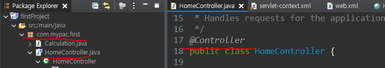 그래서 com.mypac.first 위치의 HomeController.java의 HomeController 클래스 @Controller 어노테이션을 읽어들여서 HomeController클래스를 bean으로 등록했다.