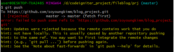 파일 내용을 수정하고 master 브랜치를 원격저장소로 push하려고 했는데 갑자기 위와 같은 오류가 생기면서 push가 되지 않았다.