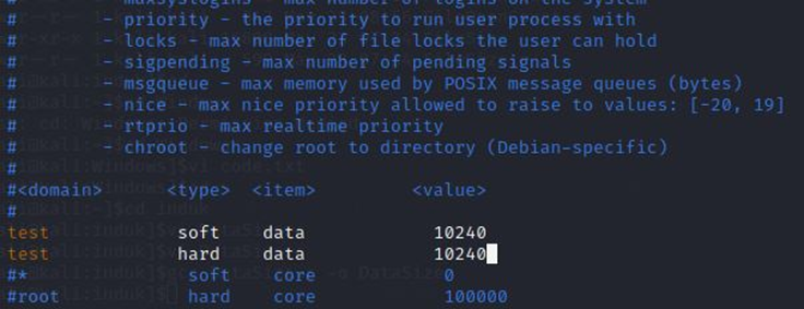 /etc/security/limits.conf를 통해 test 계정의 할당할 수 있는 메모리 크기를 10메가로 제한했다.