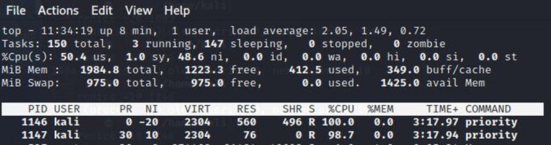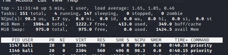 이때 top을 쳐서 실행 우선순위를 보면 부모 프로세스, 자식 프로세스가 우선순위가 같은 것을 알 수 있다.