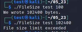 첫 번째 줄은 test계정의 파일의 최대 크기인 1메가바이트를 넘지 않아(100kb) 파일이 만들어졌다. 하지만 두 번째 줄은 파일 크기가 1메가를 넘어버려서(100mb) 파일을 만들지 못했다.