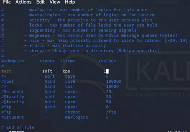 /etc/security/limits.conf를 통해 test 계정의 cpu 점유 시간을 1분으로 제한했다.