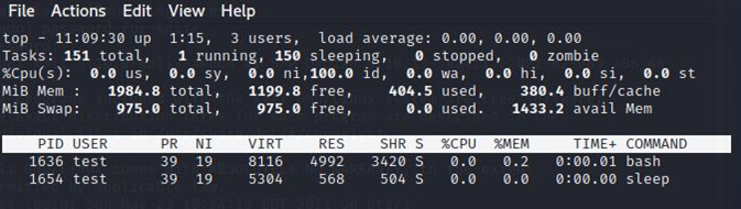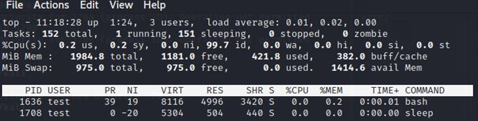 test계정으로 들어가서 sleep 100000을 치고 top을 쳤을 때의 결과이다.