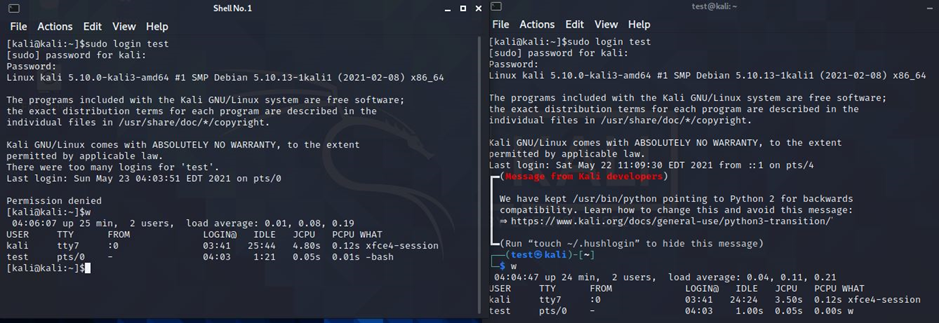 오른쪽 사진은 test계정에 첫 번째로 로그인한 것이고, 왼쪽 사진은 test계정에 한 번 더 로그인을 시도한 것이다. test의 최대 로그인 개수를 1개로 지정해 놓았기 때문에 permission denied가 뜨면서 로그인이 되지 않는다.