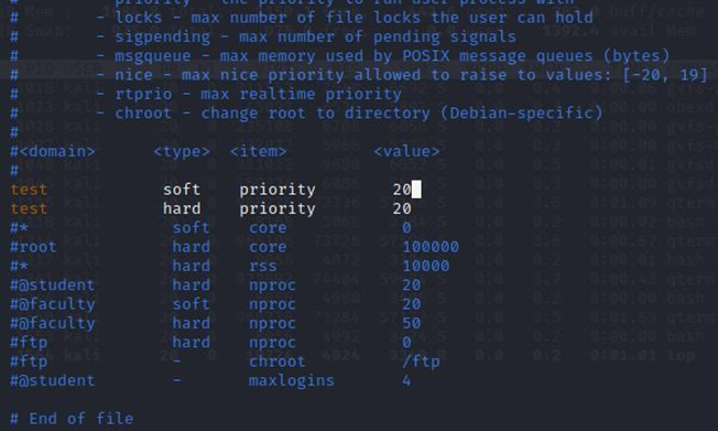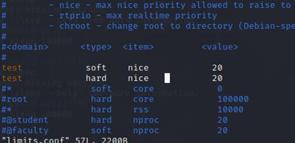 /etc/security/limits.conf를 통해 test 계정의 변경될 수 있는 우선순위의 범위를 정했다.