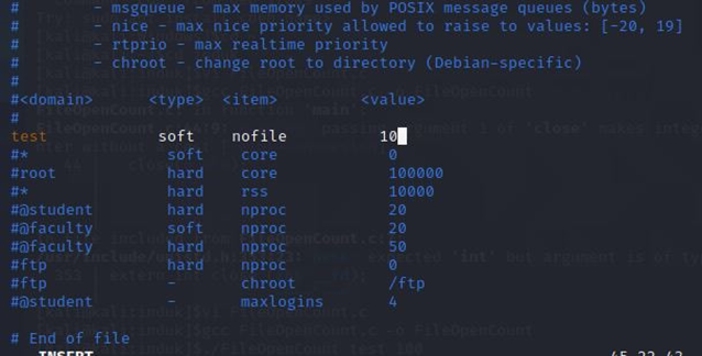 /etc/security/limits.conf를 통해 test 계정의 만들 수 있는 파일 최대 개수를 10개로 제한했다.