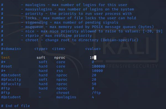 /etc/security/limits.conf를 통해 test 계정의 프로세스 개수를 10개로 제한했다.