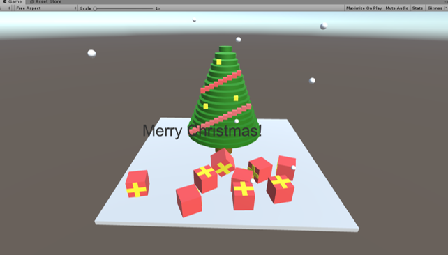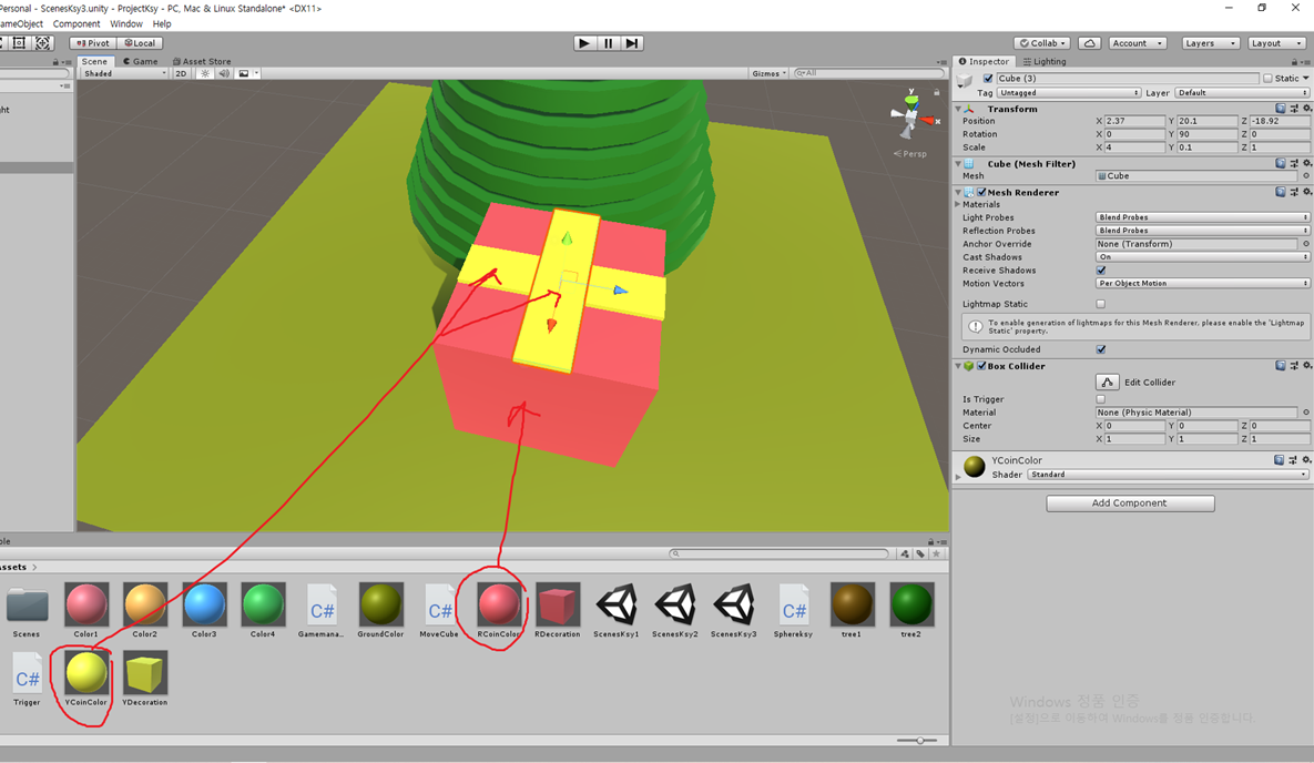 큐브 3개를 만들어서 Material을 드래그 한 후 하나는 (4, 4, 4)로 두개는(4, 0.1, 1)로 크기를 설정하여 선물 상자를 만든다.