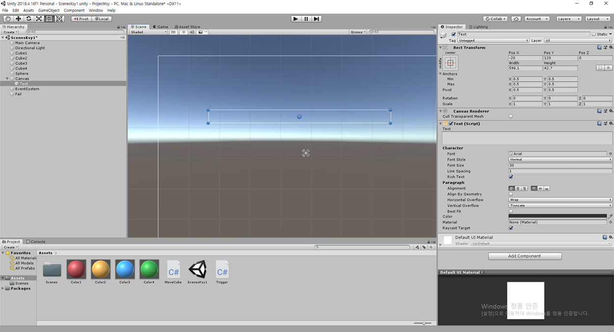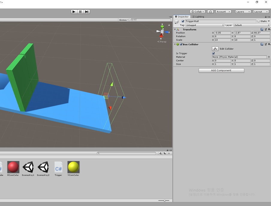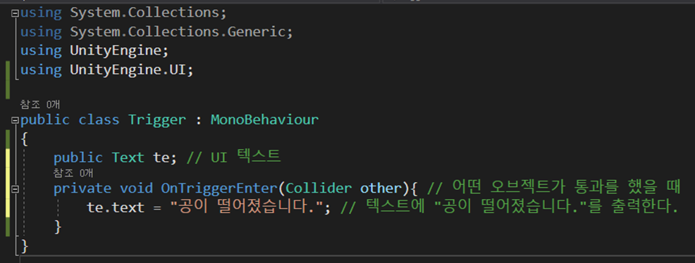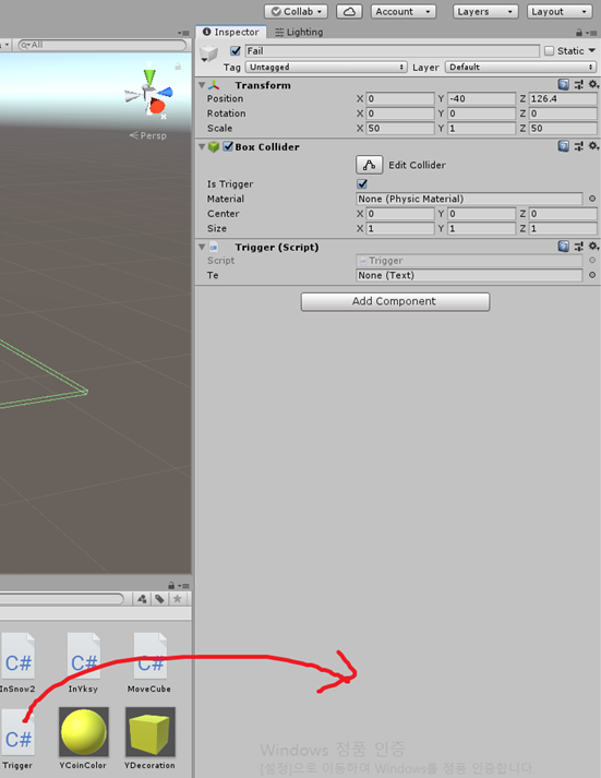 여기에 Trigger스크립트를 넣고, Text를 끌어다 놓는다.