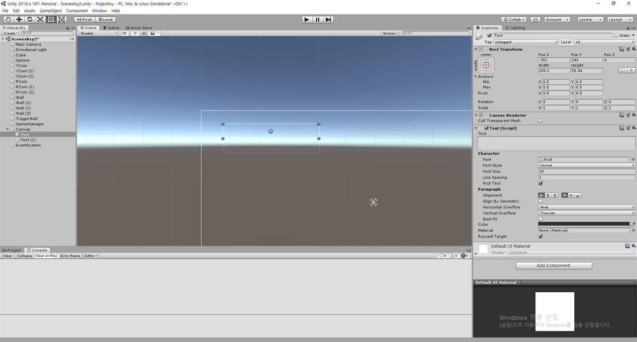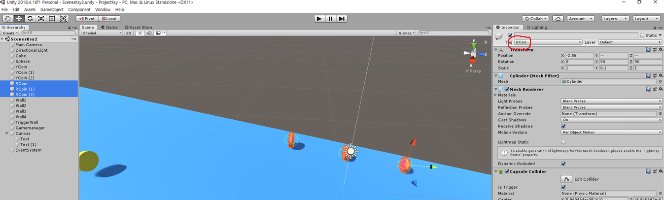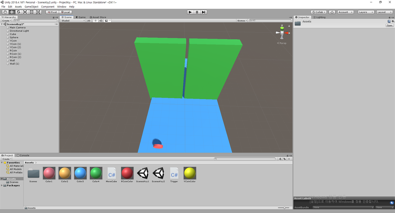 Sphereksy스크립트를 Sphere에 넣고 Wall1과 Wall2를 드래그 앤 드롭 한다.