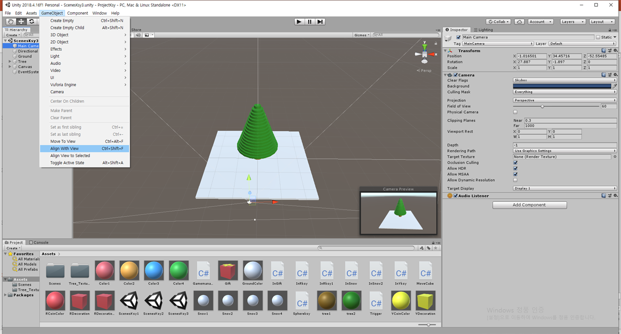 마지막으로 Align With View로 게임 화면을 Scene화면과 같게 합니다.