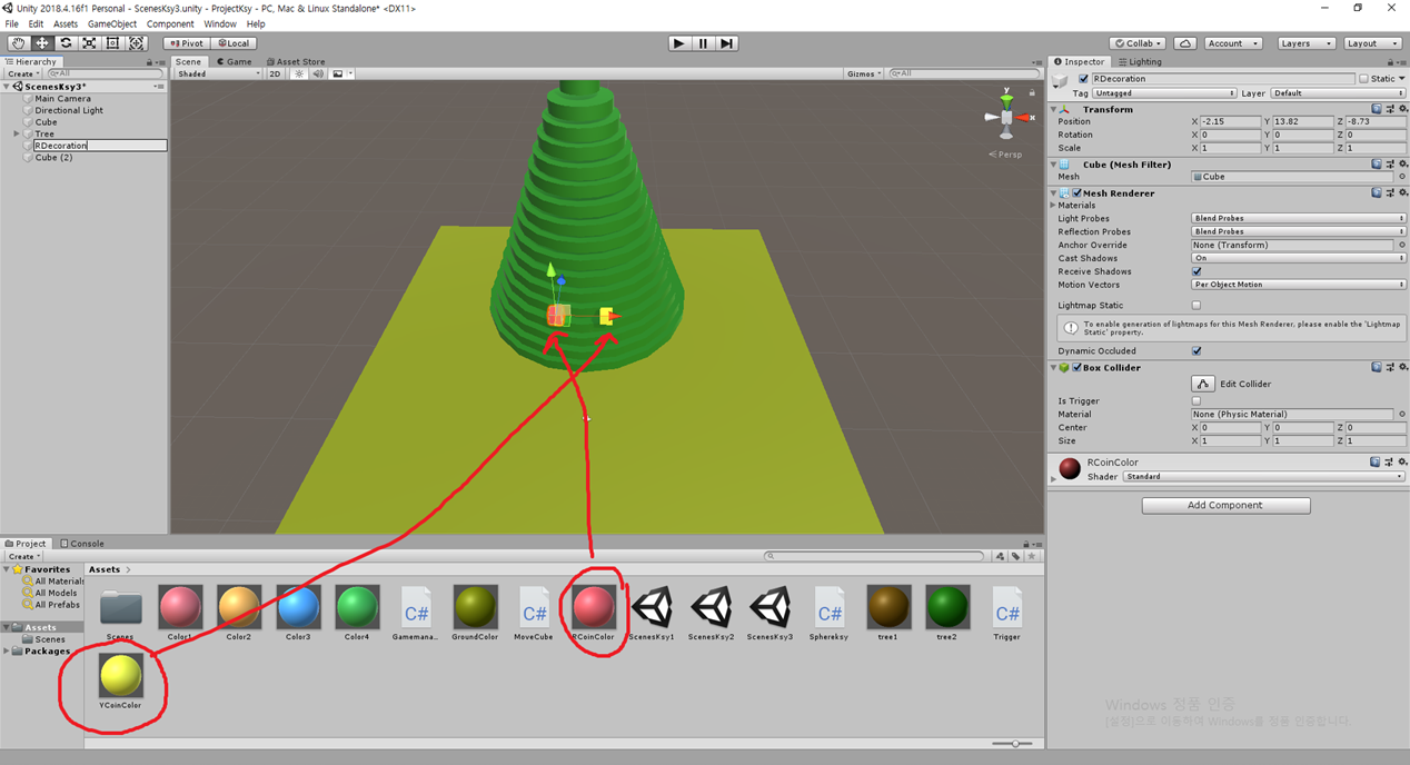 큐브를 2개 만들어서 하나는 Rdecoration, 하나는 Ydecoration이라고 이름을 바꾸고,