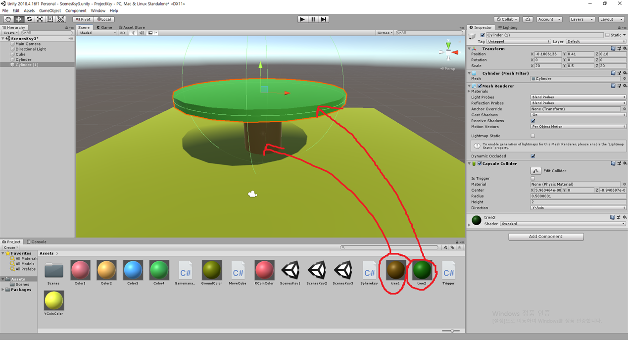 큐브 위에 Cylinder을 이용하여 나무 기둥을 만든다.