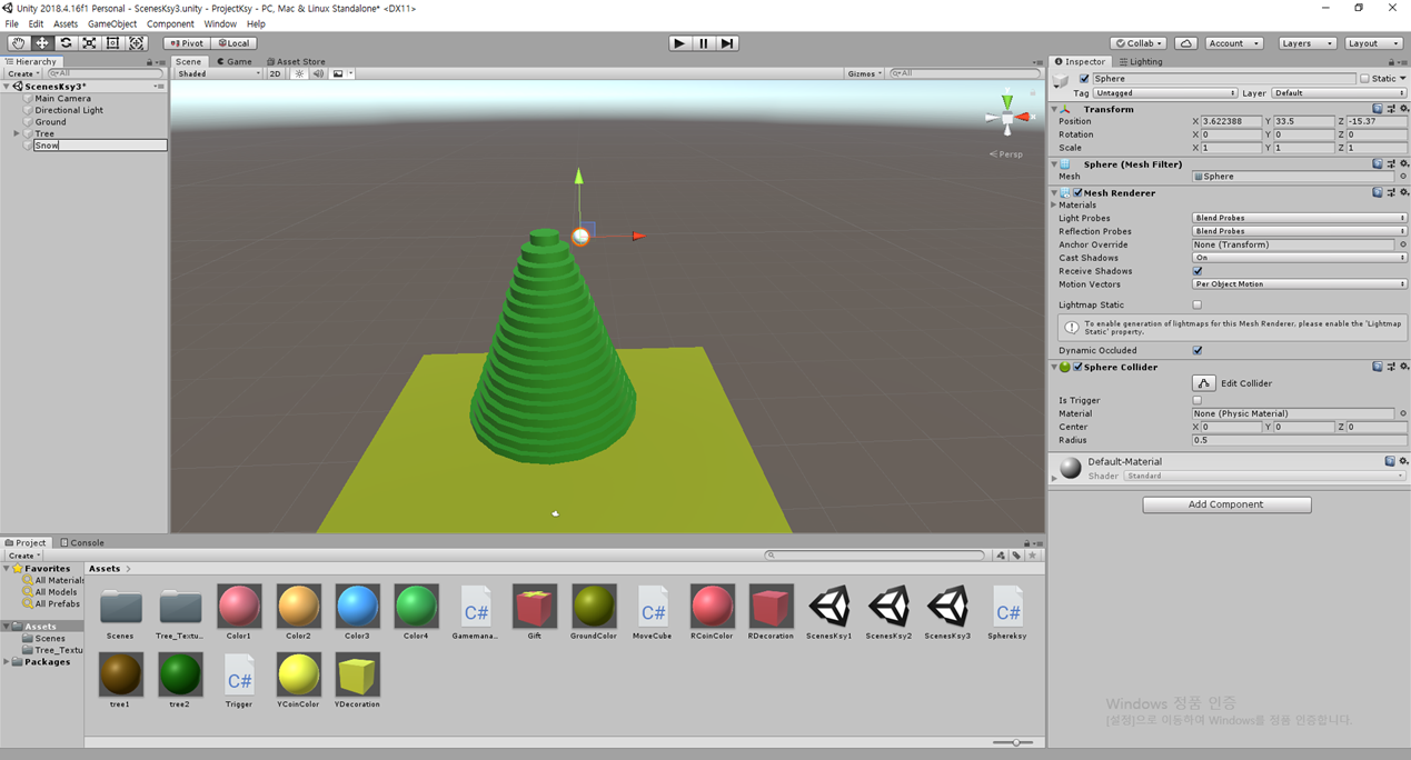 Sphere을 만들어서 크기를 (1, 1, 1)로 만들고 이름을 Snow1로 만든다.