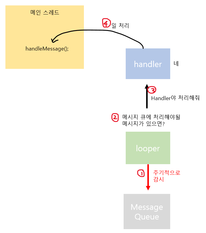 handler은 looper에게서 요청받은 메세지를 메인 스레드에서 처리한다.