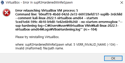 virtualbox의 디스크 파일에다 kali linux vdi 파일을 넣고 실행시켰더니 가상머신을 실행 할 수 없다고 떴다.