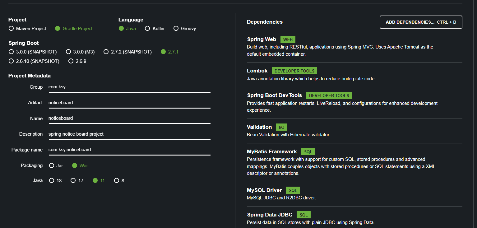 스프링 이니셜라이즈 사이트 : https://start.spring.io/