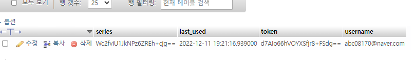 로그인 유지 체크박스에 체크하고 로그인하면 persistent_logins 테이블에 series와 토큰, 아이디가 저장된 것을 볼 수 있다.