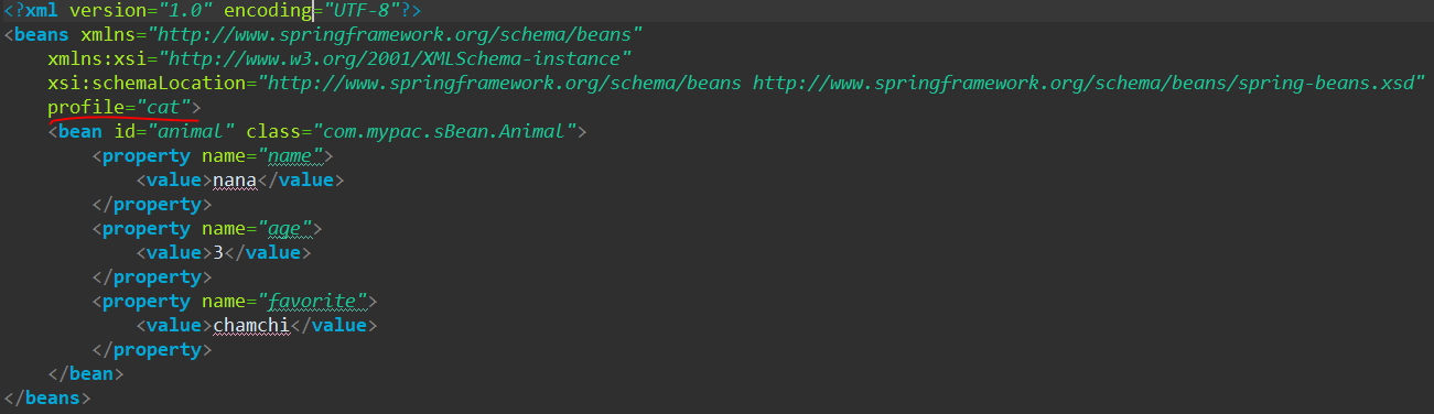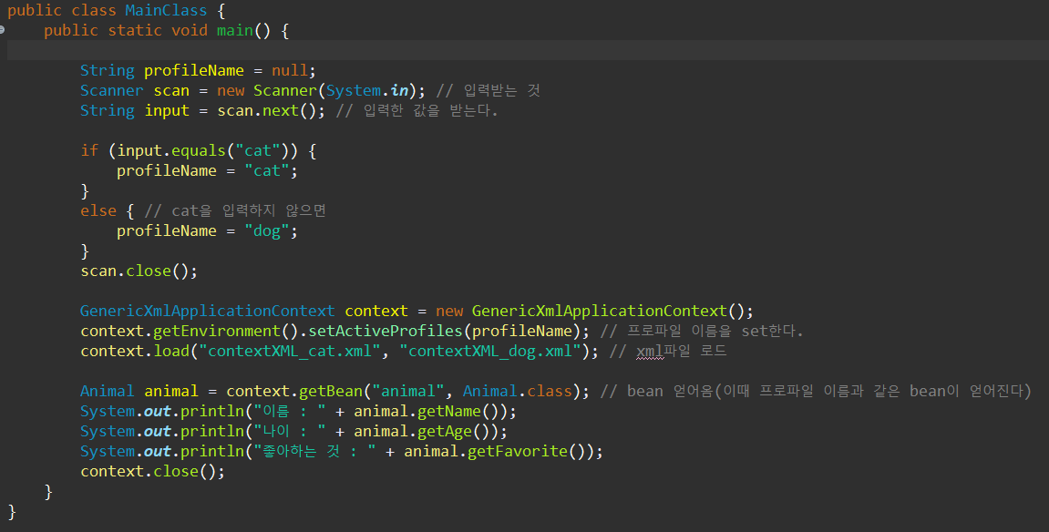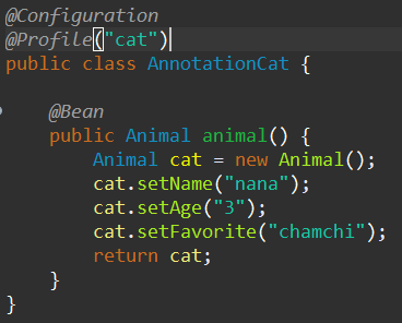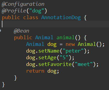 profile을 사용하면 animal이라는 이름으로 이 두개의 bean 중 하나를 선택하여 사용할 수 있다.