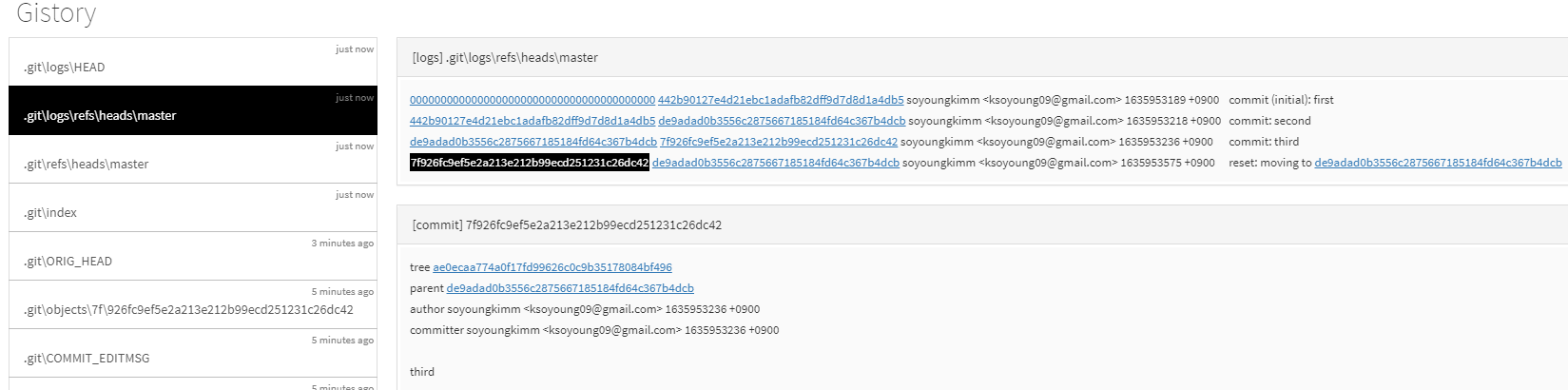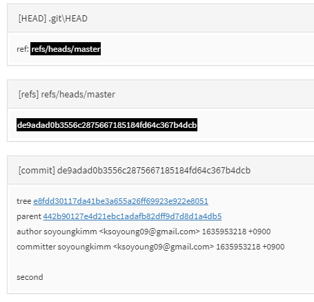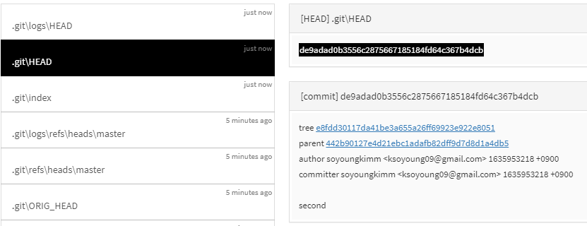 gistory를 보면 HEAD 파일이 두번 째 commit을 가리키는 것을 알 수 있다.