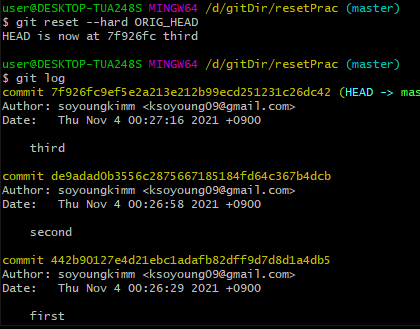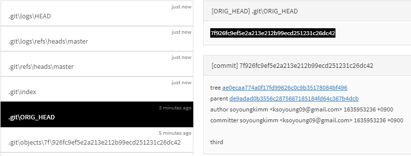 .git / ORIG_HEAD 파일을 보면 reset되어 사라진 세번 째 commit이 있다.