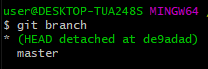 이 상태에서 git branch를 해보면 아래와 같이 head가 commit id를 가리키는 것을 볼 수 있다.