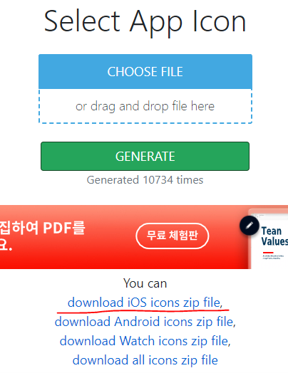 choose file 부분에다가 이미지 파일을 드래그 한후 generate를 누르고, 조금 기다렸다 download iOS icons zip file 앵커를 누른다.